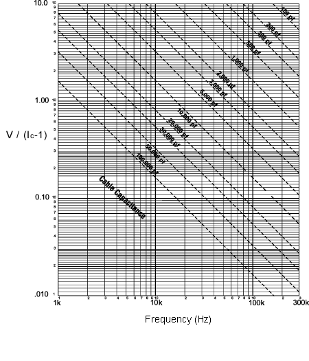 For example, when running a 100 ft. (30 m) cable with a capacitance of 30 pF/ft (98 pF/m), the total capacitance is 3000 pF. This value can be found along the diagonal cable capacitance lines. Assuming the sensor operates at a maximum output range of 5 volts and the constant current signal conditioner is set at 2 mA, the ratio on the vertical axis can be calculated to equal 5. The intersection of the total cable capacitance and this ratio result in a maximum frequency of approximately 10.2 kHz.